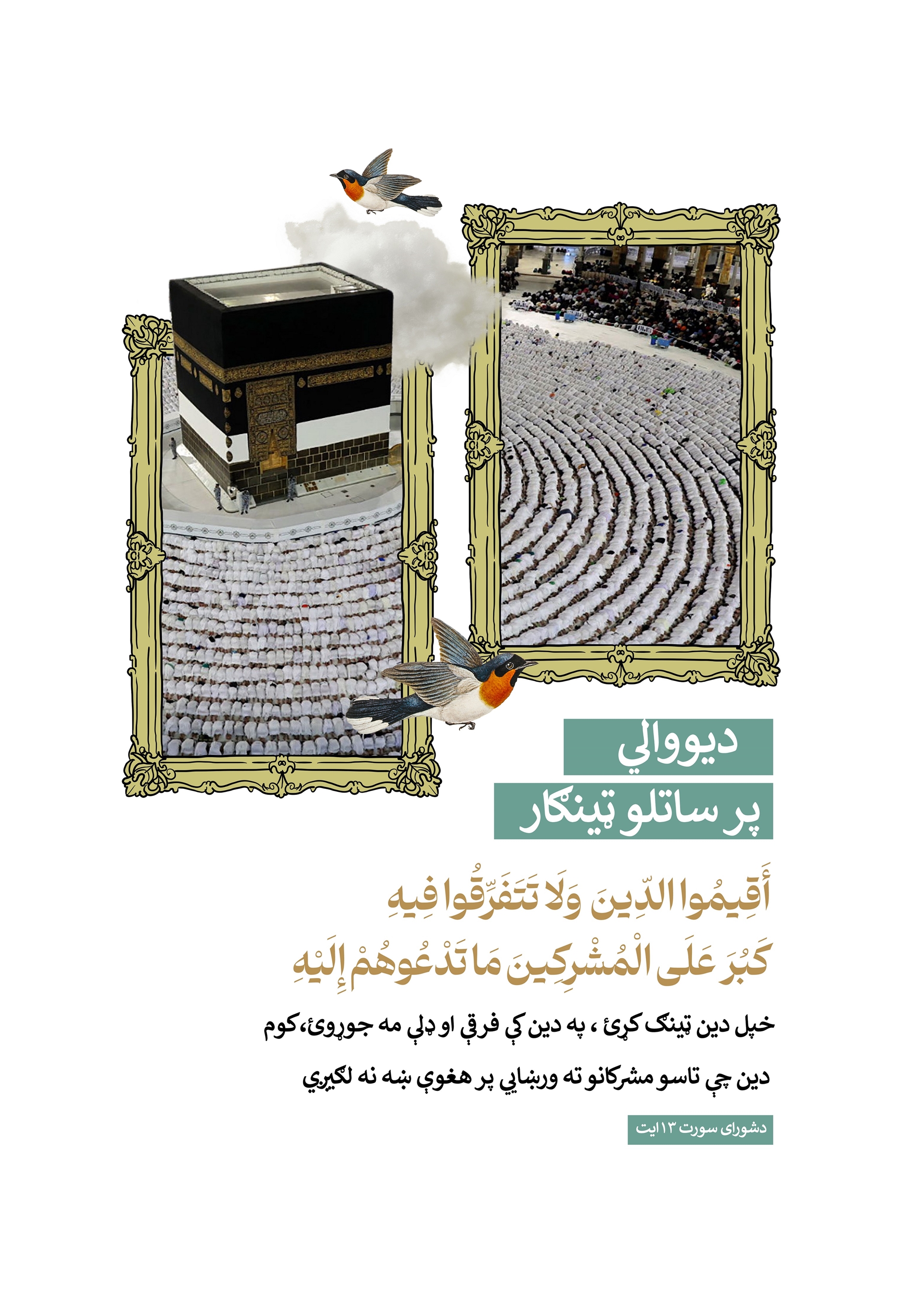 خپل دین ټینګ کړئ ، په دین کې فرقې او ډلې مه جوړوئ، کوم دین چې تاسو مشرکانو ته ورښایی پر هغوې ښه نه لګیږی.